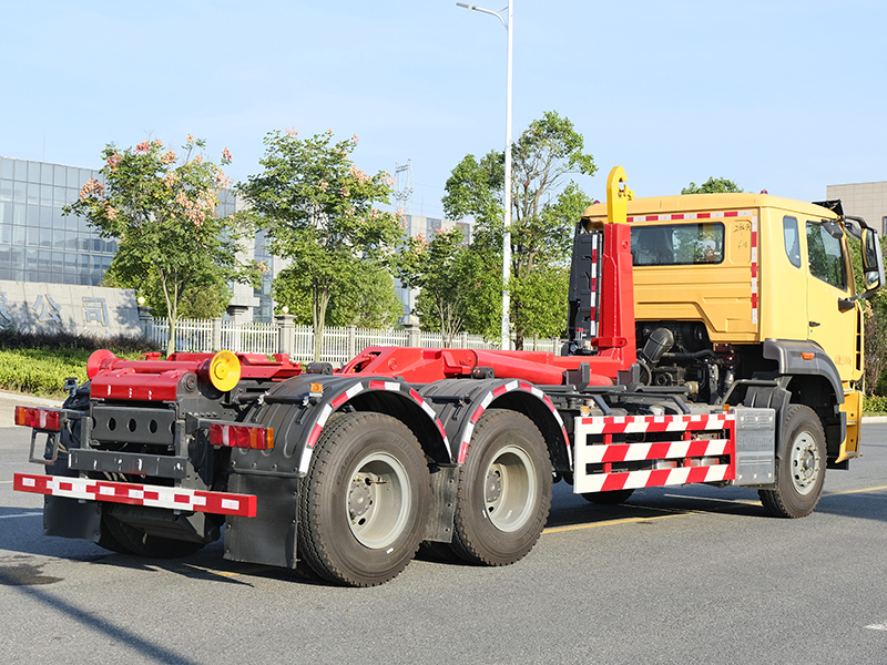 該車可將地下垃圾箱內(nèi)的垃圾及垃圾箱一同拉車上運走同時可自卸,降低了工人的勞動強度。該垃圾車的收運方式是目前世界上廣泛采用的垃圾收運方式,可以實現(xiàn)一車多箱,大大降低了配備成本和空間等等;其專用裝置的功能均以汽車發(fā)動機為動力,通過液壓機構(gòu)手動或電控來實現(xiàn)。車輛的箱體采用優(yōu)質(zhì)炭鋼板全密封焊接結(jié)構(gòu),具有強度高、重量輕、不產(chǎn)生二次污染等優(yōu)點。