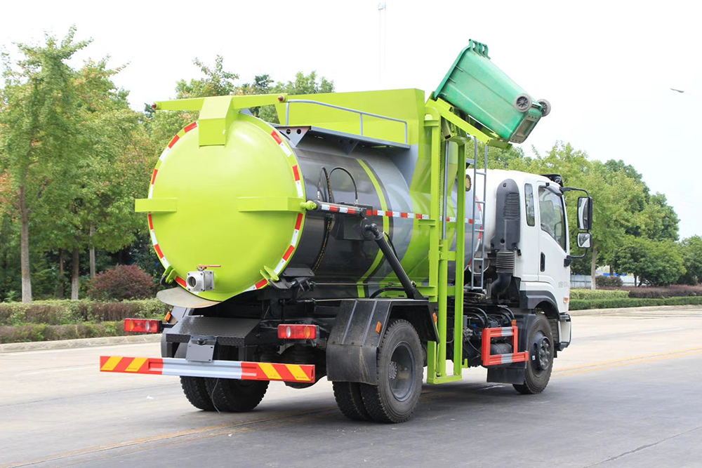 泔水裝載由垃圾桶提升系統(tǒng)完成,該系統(tǒng)具有垃圾桶鎖止結(jié)構(gòu),裝卸安全可靠。垃圾桶與垃圾投入口銜接好,保證裝卸過(guò)程中餐廚垃圾不溢撒、不遺漏。垃圾投入口與推板之間有足夠距離,推板與罐體內(nèi)表面設(shè)有密封裝置,避免餐廚垃圾投入過(guò)程及分離過(guò)程中溢到推板后方。 液壓系統(tǒng)由泵、液壓閥和順序閥以及各種功能的液壓油缸、高低壓管路組成。關(guān)鍵部件可選用原裝進(jìn)口,保證產(chǎn)品工作可靠、安全。